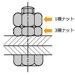 3種ナットを先に取り付け、外側に1種ナットをロックナットとして取り付けてください。荷重は外側のナットにかかりますので外側のナットを薄いもの(3種ナット)にしてはいけません。